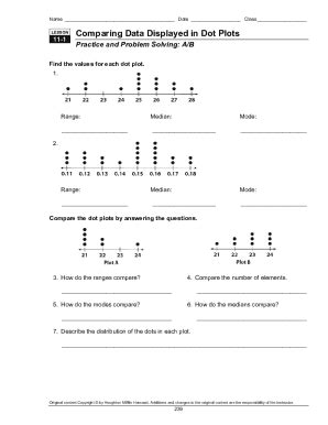 Creating a dot plot worksheet is fairly simple and can be done in a few easy steps. First, you need to figure out what data you want to include in the worksheet. This can include things like numbers, percentages, or any other type of data. Once you have the data, you can create a chart by plotting the data points onto the graph. Each point should be connected to the other points with lines to create the "dot" pattern.